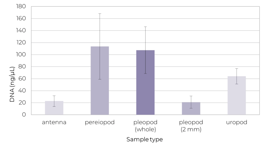 Figure 7. DNA concentrations obtained with the QubitTM dsDNA BR Assay Kit. The different shrimp parts resulted in a DNA yield ranging from 21 to 115 ng/μL. The data are presented as mean (n=8, ±1 SD).