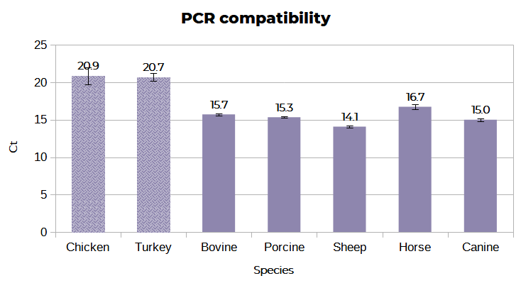 Figure 3. Ct values obtained from qPCR after extraction from whole blood of different animal species (n=3). For Chicken and turkey 1 μL eluate, for all others 4 μL eluate, where used as PCR input.