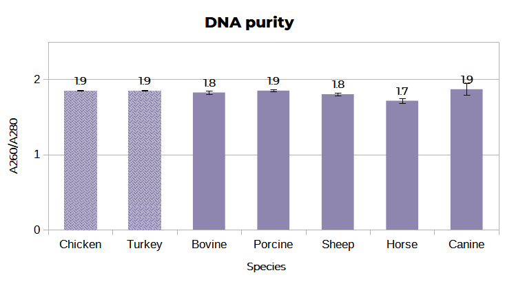 Figure 2. DNA purity obtained after DNA extractions from whole blood of different animal species. All purity ratios indicate highly pure DNA (A260/A280 > 1.7).