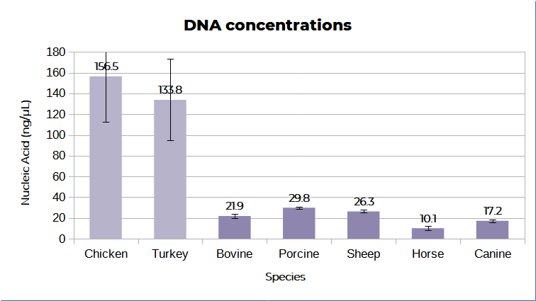 Figure 1. Nucleic acid concentration obtained from DNA extractions from whole blood of different animal species (n=3). Chicken and turkey blood was lysed for 1 hour, mammalian blood was lysed for 10 min.