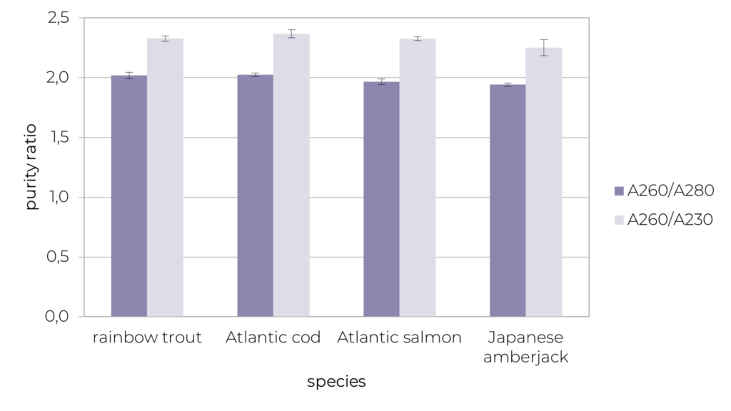 Figure 5. DNA purity ratios of different fish species obtained by UV-VIS with the NanoDropTM One. The data presented are mean values of DNA extractions from 20 mg sample (n= 8, ±1 SD).