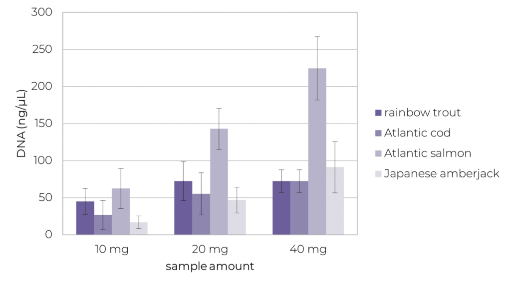 Figure 4. DNA concentrations of different fish species obtained with the QubitTM dsDNA BR Assay Kit. The different input amounts (10, 20 and 40 mg) resulted in a DNA yield ranging from 16 to 225 ng/μL. The data presented are mean values (n= 8, ±1 SD).