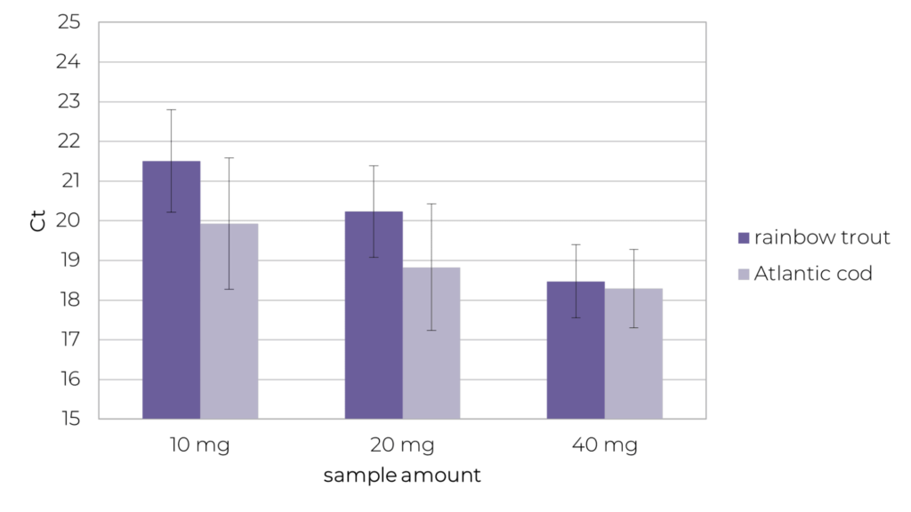 Figure 6. Ct values obtained from DNA extracted from trout and cod fin by PCR using primers targeting the mitochondrial cytochrome oxidase subunit I gene (cox1). DNA samples were 1:10 diluted before PCR. Ct values between 18 and 22 are reported by the AriaMx Real-Time PCR system (10, 20, 40 mg). The data presented are mean values (n= 8, ±1 SD).