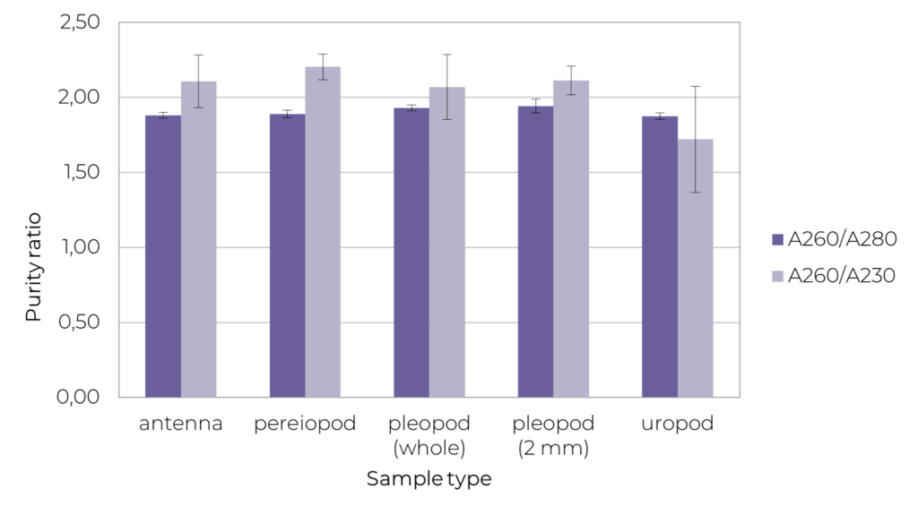 Figure 8. DNA purity ratio’s for different parts of shrimp obtained by UV-VIS with the NanoDropTM One. High purity ratios are measured for the extracted DNA from all shrimp parts. The data are presented as mean (n=8, ±1 SD).