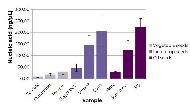 Figure 1. DNA concentrations extracted from vegetable, field crop and oil seeds, measured by UV-VIS with the NanoDropTM One. The data are presented as mean (n=3, ±1 SD).