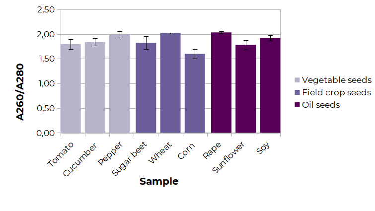 Figure 2. DNA purity ratios for tomato, cucumber, pepper, corn, sugar beet, wheat, rape, sunflower and soybean seeds obtained by UV-VIS with the NanoDropTM One. High purity ratios are measured for all seeds. Data are presented as mean (n=3, ±1 SD).